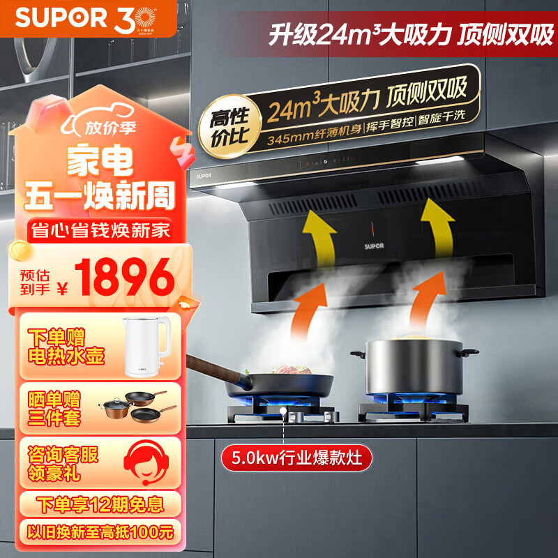 苏泊尔(SUPOR) 抽油烟机 顶侧双吸7字型烟灶套装24立方挥手免拆洗家用烟机燃气灶具套装DE15+Q5天价格:1946.00元!