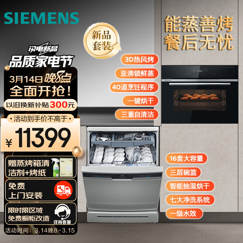 西门子(SIEMENS)洗嵌套装 16套智能抽湿烘干大容量洗碗机 嵌入式蒸烤炸炖四合一套装 CS8J4DNB1W+SJ23HI88MC价格:11399.00元!
