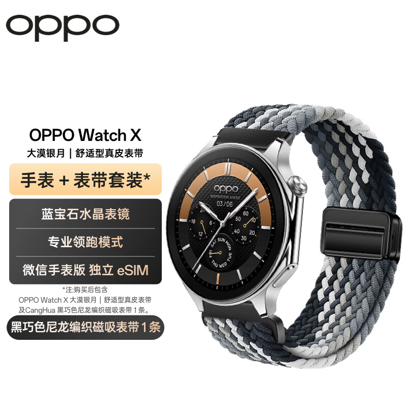 OPPO Watch X 大漠银月 全智能手表 运动健康手表 男女eSIM电话手表+黑巧色尼龙编织表带套装价格:2442.00元!