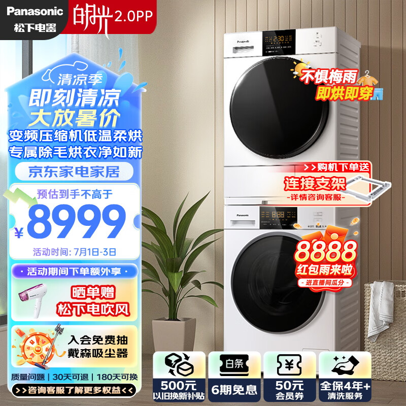 松下(Panasonic)白月光2.0PP 洗烘套装 10kg滚筒洗衣机+热泵烘干机 变频压缩机 光动银除菌 除毛烘 3E1AK+82QR1价格:9989.00元!