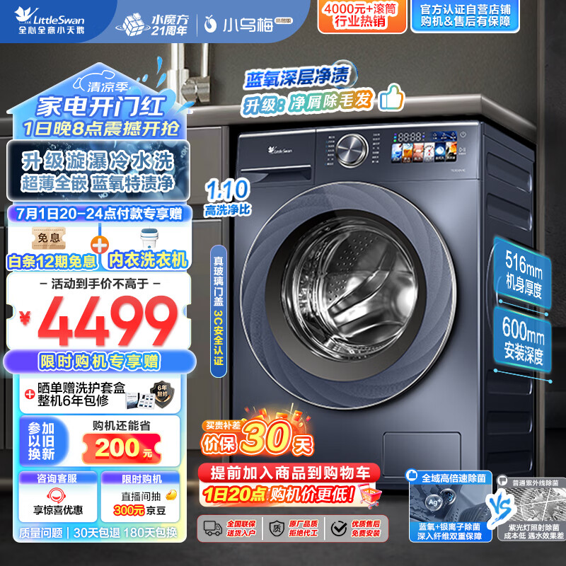 小天鹅(LittleSwan)滚筒洗衣机全自动家用 超薄全嵌【小乌梅高奢 TG100VIC】蓝氧净渍 内衣洗 10公斤大容量 以旧换新价格:4599.00元!