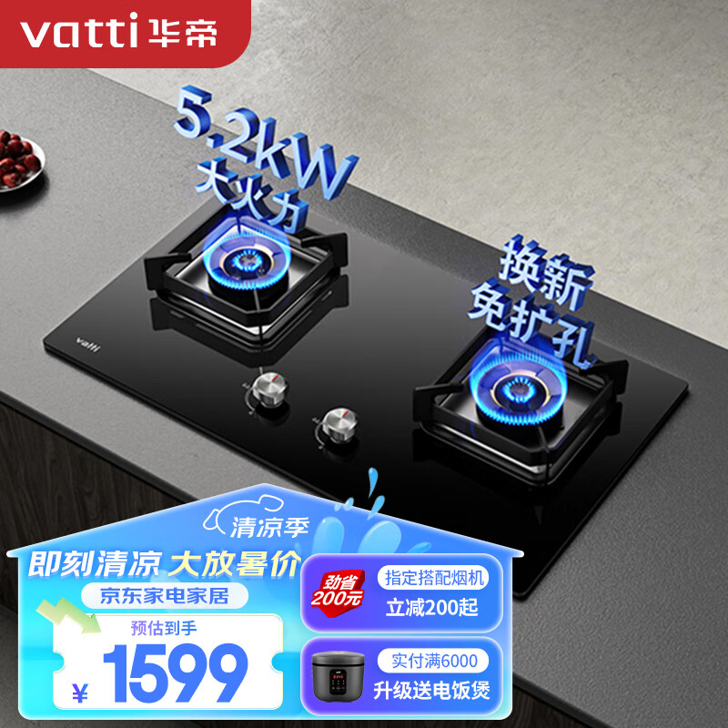 华帝(VATTI)燃气灶家用嵌入式5.2kW超大火力高热效易打理猛火灶换灶不改孔灶具灶台JZT-i10090B(天然气)价格:1599.00元!