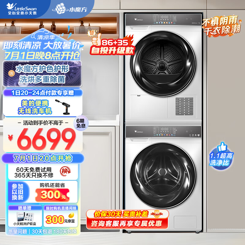 小天鹅(LittleSwan)水魔方洗烘套装 10KG滚筒洗衣机全自动+热泵烘干机 智能投放 1.1洗净比 白色 TG100VC806W+806价格:6699.00元!