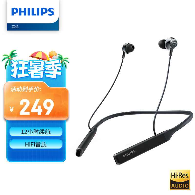 飞利浦(PHILIPS)无线蓝牙耳机颈挂式耳机HiFi耳机 快充Hi-Res高解析苹果华为小米安卓手机通用TAPN402黑价格:249.00元!