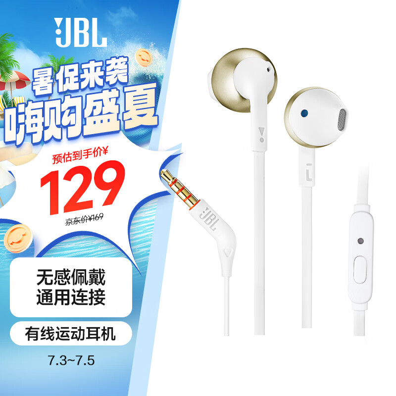 JBL T205 半入耳式耳机 TUNE205手机耳机 有线运动耳机 带麦克风 苹果安卓系统通用 香槟金价格:169.00元!