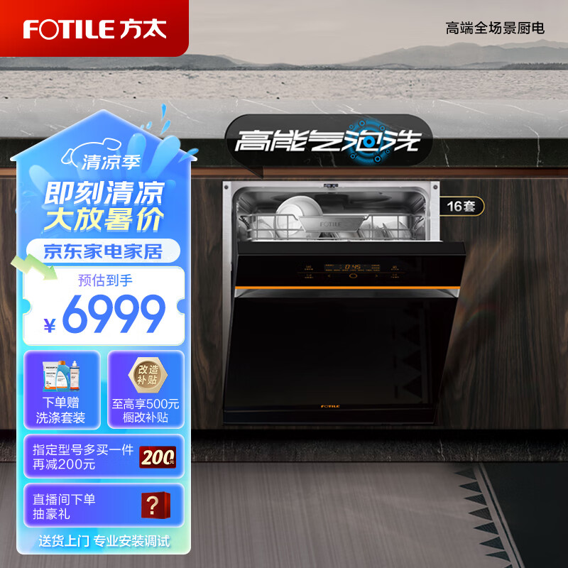 方太洗碗机嵌入式家用 高能气泡洗 16套大容量锅碗一次洗 除幽门螺旋杆菌 7天长效存储 一级水效VJ08价格:6999.00元!