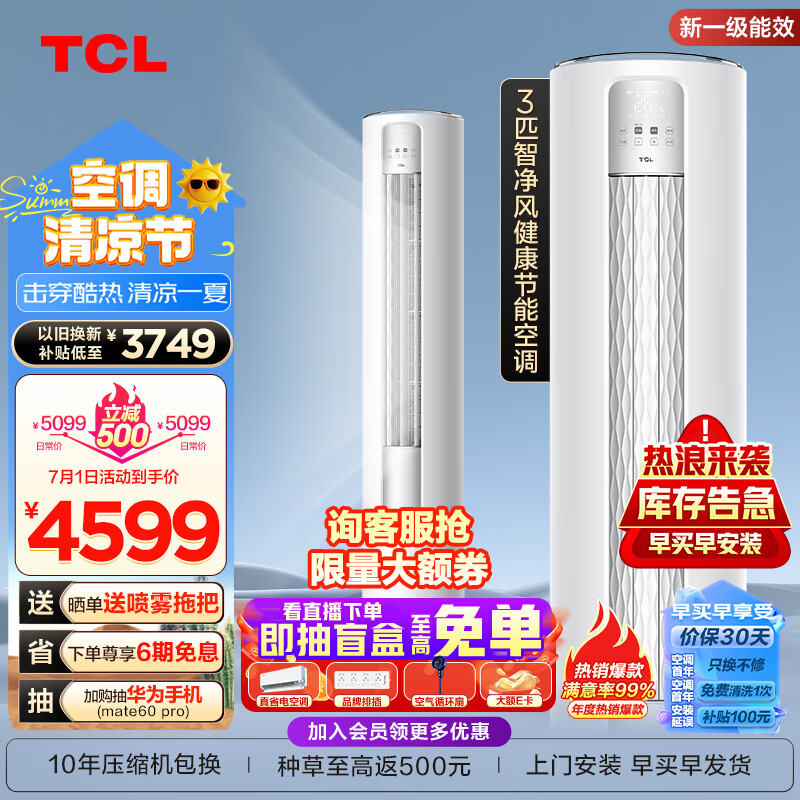 TCL空调 3匹 新一级能效 变频冷暖 智能 智净风 除菌客厅空调立式空调柜机KFR-72LW/JV2Ea+B1以旧换新价格:4580.00元!