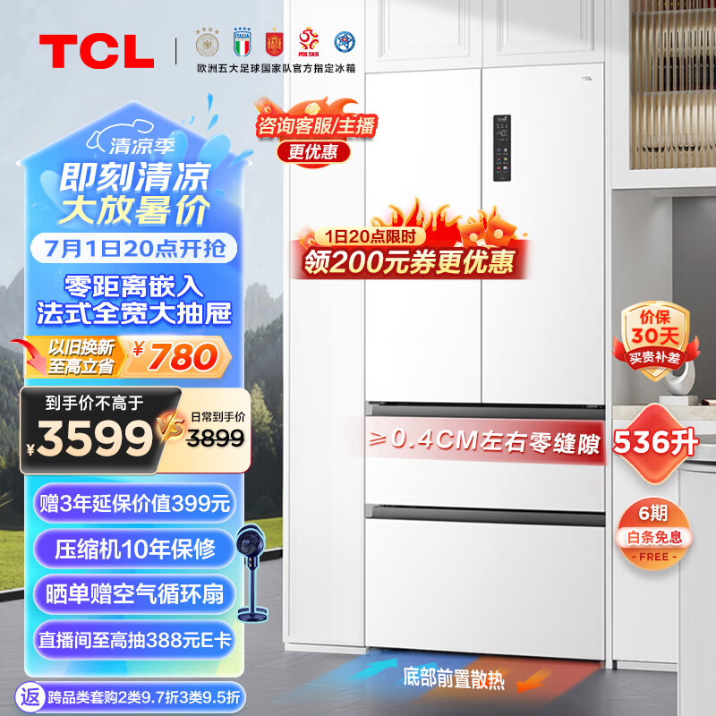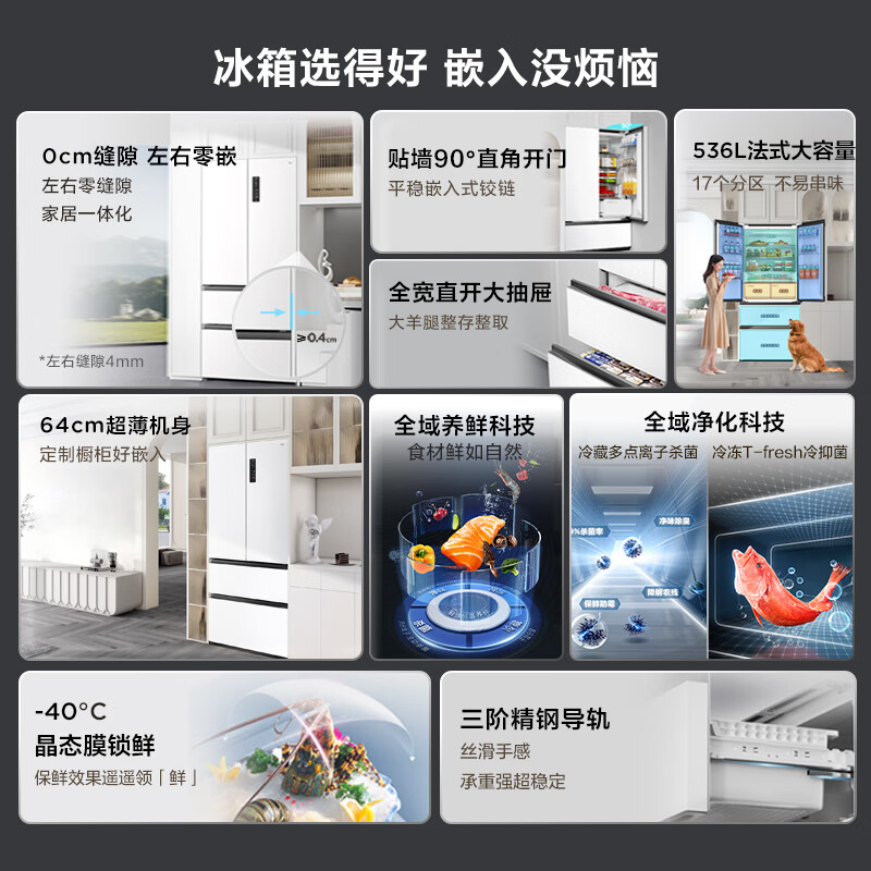 TCL 536升T9法式四开门超薄零嵌入式冰箱白色底部散热杀菌除味双循环一级能效家用电冰箱R536T9-DQ价格:4099.00元!