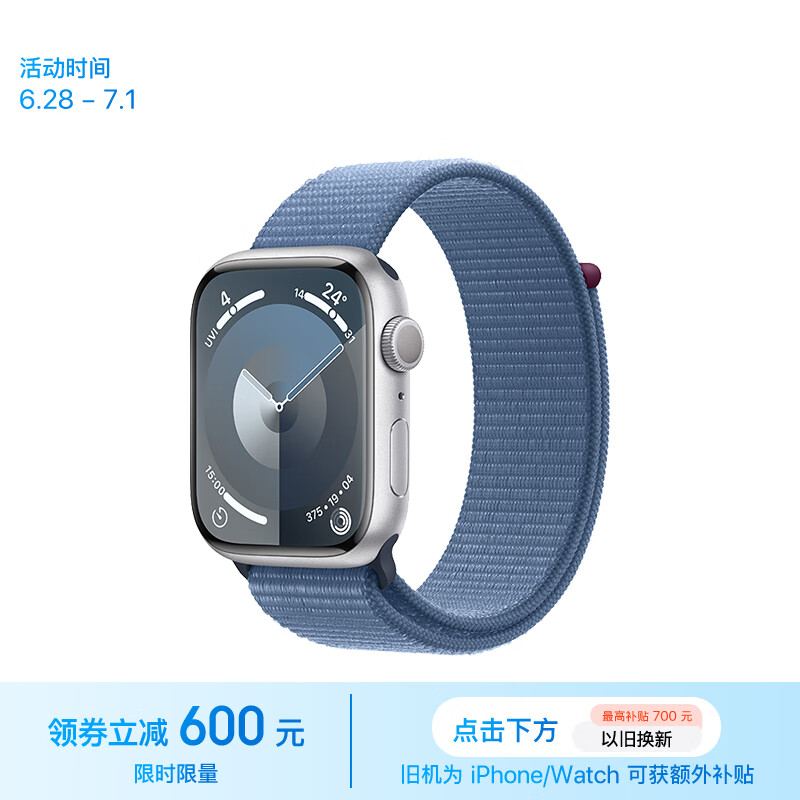 Apple/苹果 Watch Series 9 智能手表GPS款45毫米银色铝金属表壳 凛蓝色回环式运动表带 MR9F3CH/A价格:3199.00元!