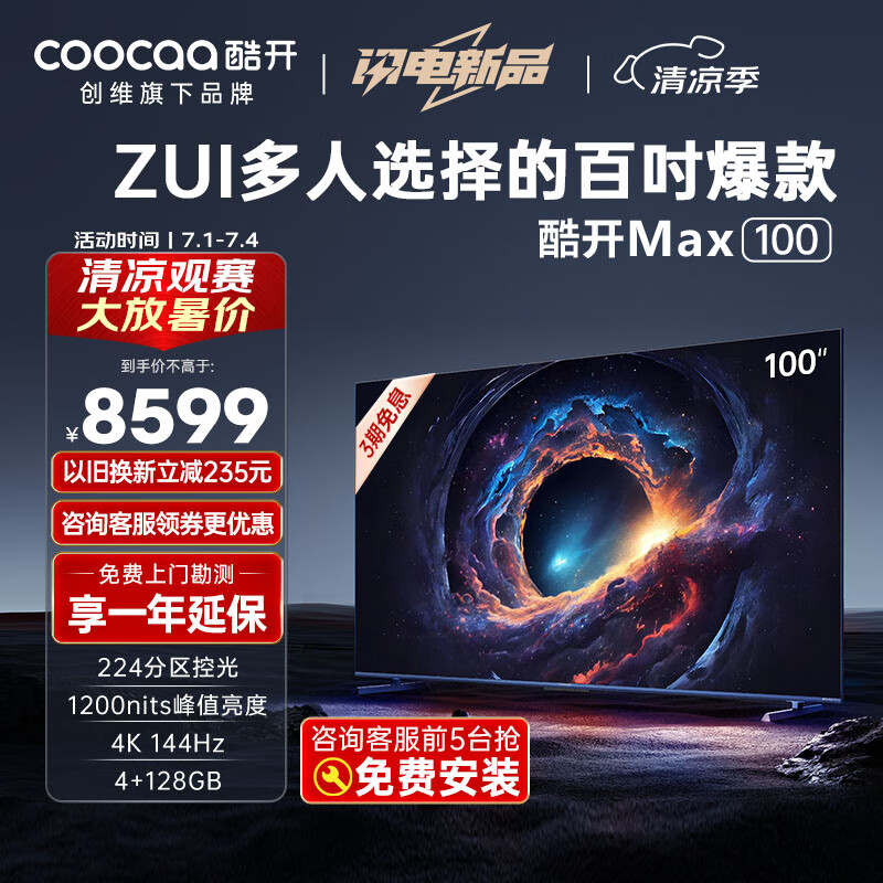 酷开创维Max100 100英寸电视1200nits峰值亮度 分区控光 4+128GB 欧洲杯144Hz高刷电视机100P60 P价格:8599.00元!