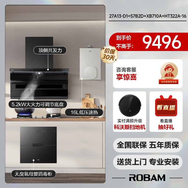 老板(Robam)厨房多件套抽油烟机小黑翼顶侧双吸25风量烟机灶具消毒柜燃气热水器D1+57B2DT+XB710A+HT322A-16价格:9796.00元!