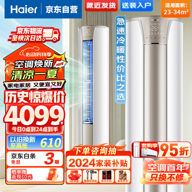 海尔(Haier)空调2匹3级能效静悦变频新能效客厅圆柱空调立式柜机自清洁 京东小家智能快速制冷智能物联50KCA83价格:4099.00元!