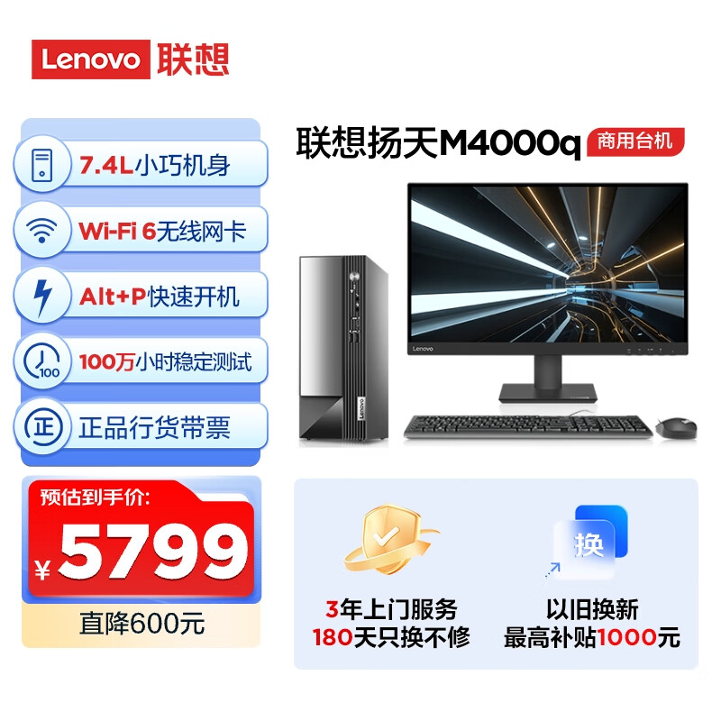 联想(Lenovo)扬天M4000q 商用办公台式电脑主机(酷睿13代i7-13700 16G 1T+512G SSD)27英寸价格:5799.00元!