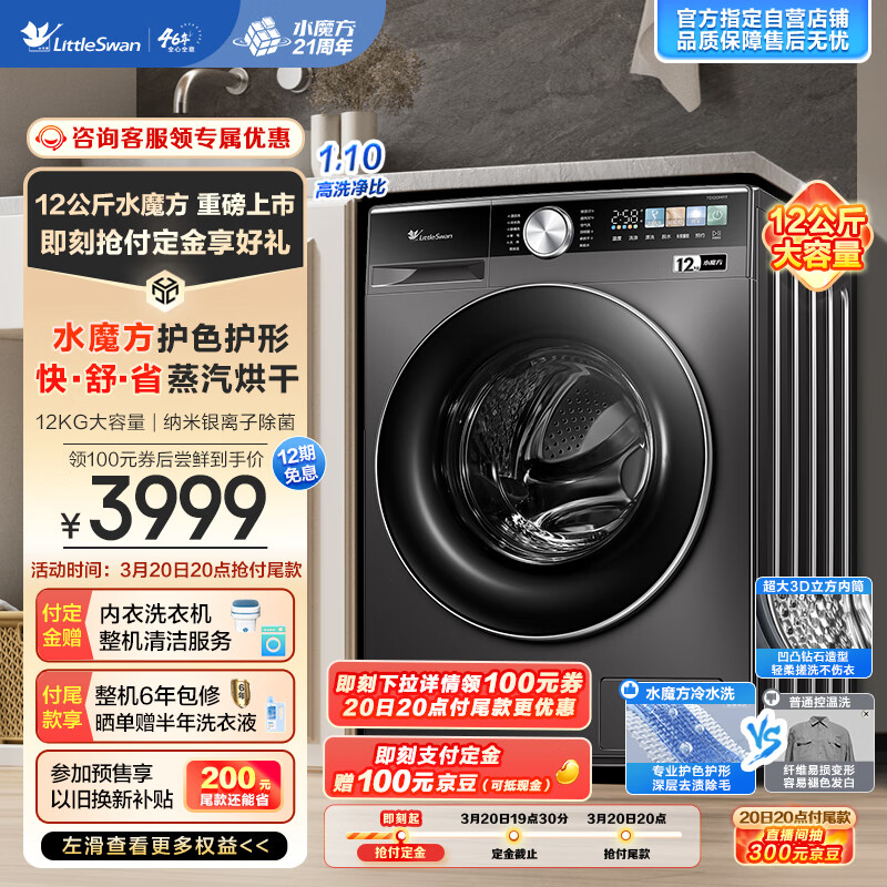 小天鹅(LittleSwan)滚筒洗衣机全自动 洗烘一体洗衣机【TD120M11T】水魔方冷水洗 12公斤大容量 1.1高洗净比 以旧换新价格:4099.00元!