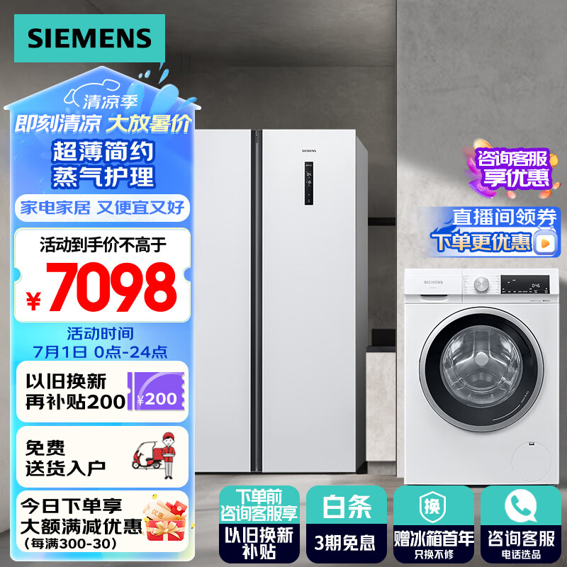 西门子(SIEMENS)冰洗套装502L超薄嵌入对开门冰箱+10kg洗烘一体KA50NE20TI+WN52A1004W价格:7878.00元!