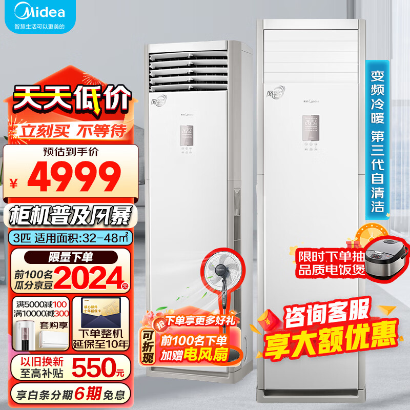 美的(Midea)空调柜机 风客 变频冷暖方形柜机大风量设计落地式立式客厅 3匹KFR-72LW/N8MFB3价格:4999.00元!