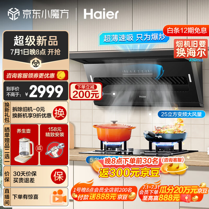 海尔(Haier)抽油烟机 顶侧双吸烟灶套装 变频25m3/min大吸力 家用厨房吸油烟机燃气灶具套装C61+Q2BE3天价格:3199.00元!