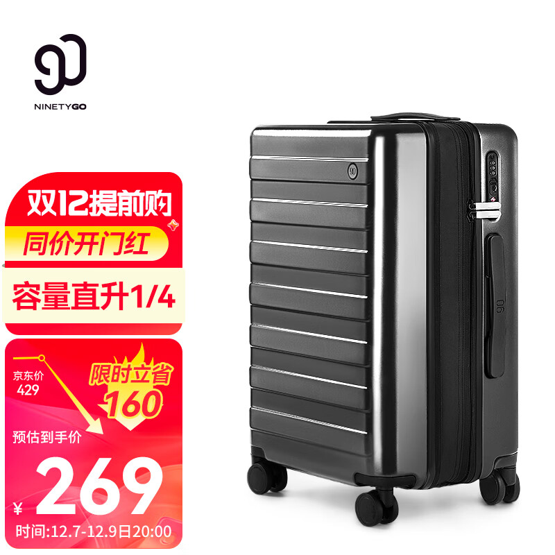90分扩容行李箱旅行拉杆箱20英寸男女大容量皮箱PC耐磨登机箱钛金灰价格:269.00元!