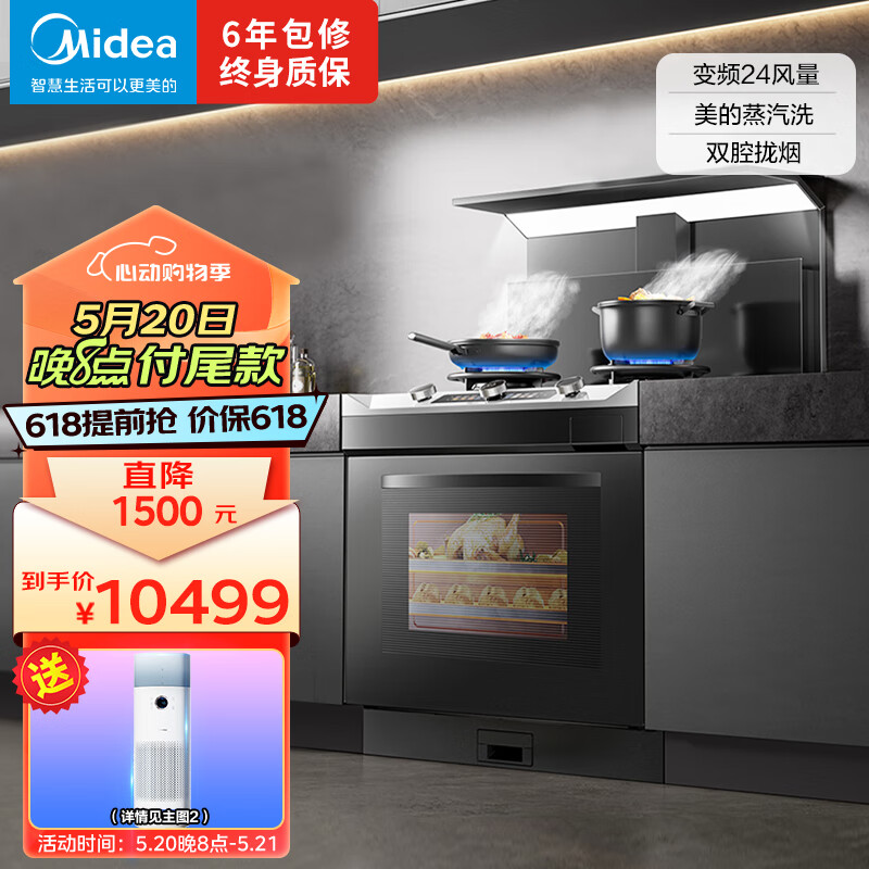 美的(Midea)晴空系列蒸烤一体集成灶 变频24风量油烟机 蒸汽洗 5.2kW燃气灶 大容量蒸烤炸 黑色FX90 天然气价格:10999.00元!
