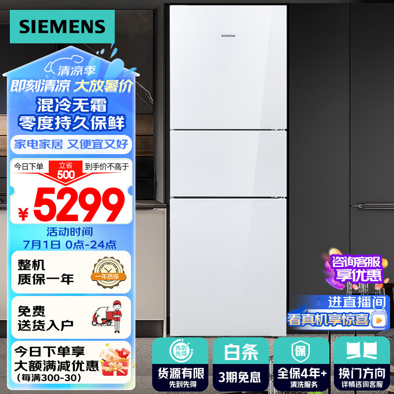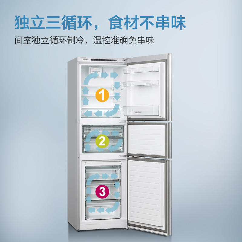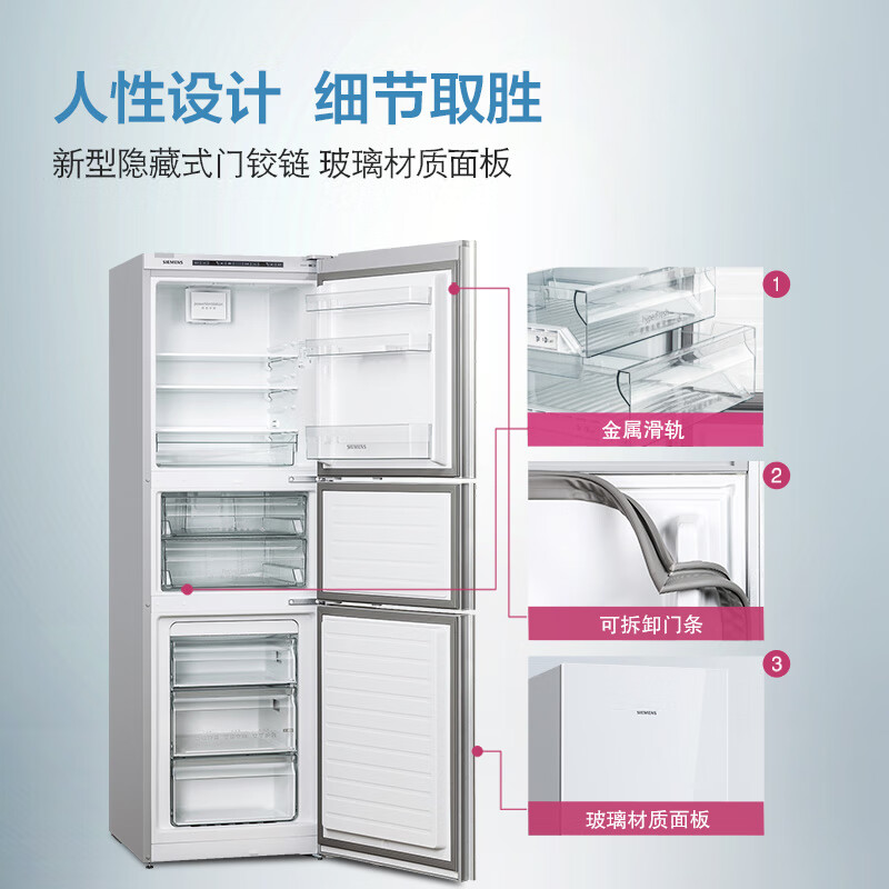 西门子(SIEMENS)274升三门冰箱 玻璃面板 混冷大容量 零度保鲜 线下同款 BCD-274W(KG28US221C)价格:5869.00元!