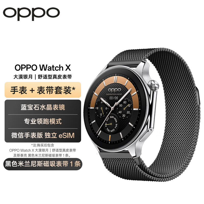 OPPO Watch X 大漠银月 全智能手表 运动健康手表 男女eSIM电话手表+黑色米兰尼斯表带套装价格:2428.00元!