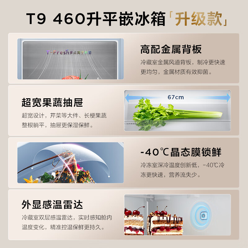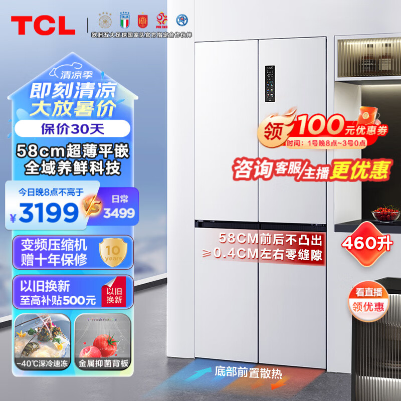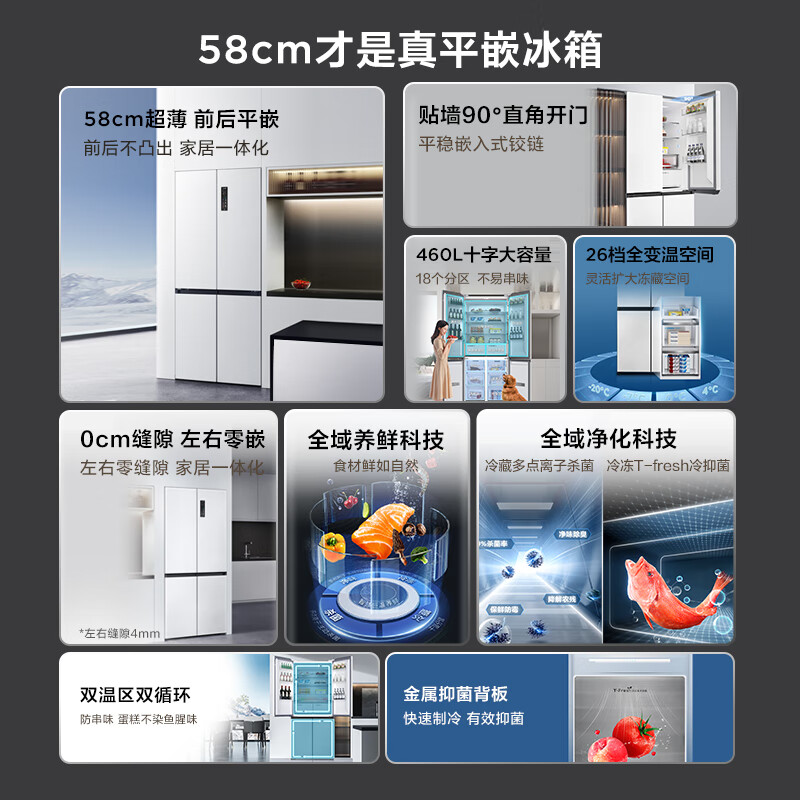 TCL 460升T9十字门超薄平嵌冰箱白色 58cm超薄机身一级能效变频 底部散热 宽幅变温 杀菌除味双循环 R460T9-UQ韵律白价格:3499.00元!