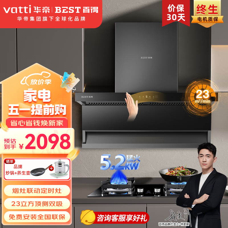 百得(BEST)华帝出品 顶侧双吸油烟机燃气灶具套装 23立方大吸力挥手感应自动洗 E632+QE55(液化气)价格:2248.00元!