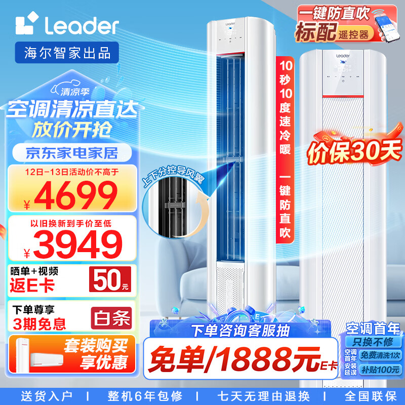 Leader空调 海尔智家出品 元气3匹空调柜机 新一级能效 客厅变频空调立式 KFR-72LW/03LKC81TU1以旧换新价格:4699.00元!