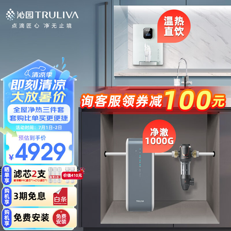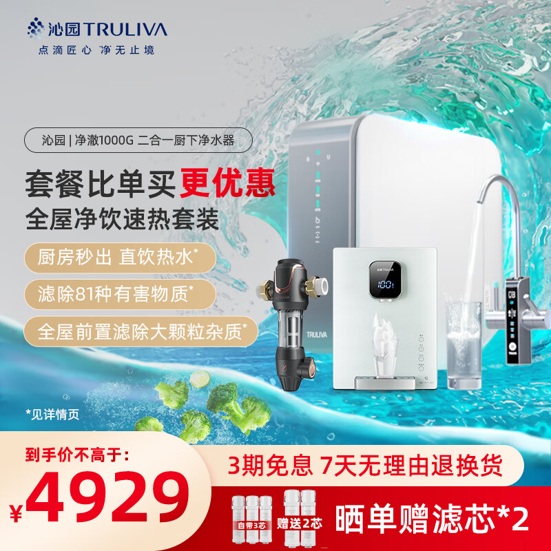 沁园(TRULIVA)净澈双出水1000G三件套装 净水器UR-SX51070+前置过滤器P-A5510+加热管线机LNW580-5W价格:4929.00元!