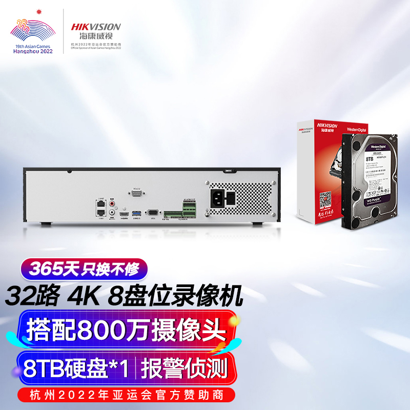 海康威视网络硬盘录像机监控32路8盘位兼容8TNVR满配32个摄像头带8TB硬盘DS-8832N-R8价格:4595.00元!
