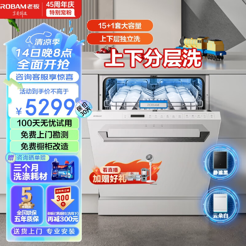 老板(Robam)F80D白15+1套容量去重油污嵌入式洗碗机热风烘干消毒168h长效存储一体机独立式分层洗价格:5299.00元!