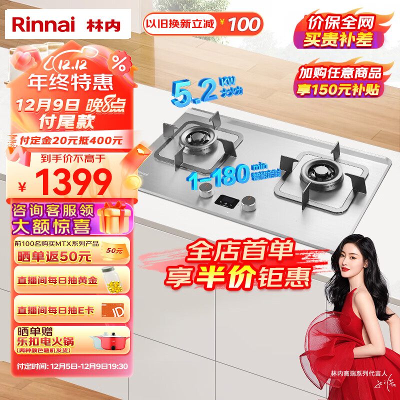 林内(Rinnai)【哪吒系列】家用嵌入式天燃气灶 台嵌两用可调节底盘 5.2kW双眼猛火定时灶 不锈钢 JZT-2E08MTX价格:1399.00元!