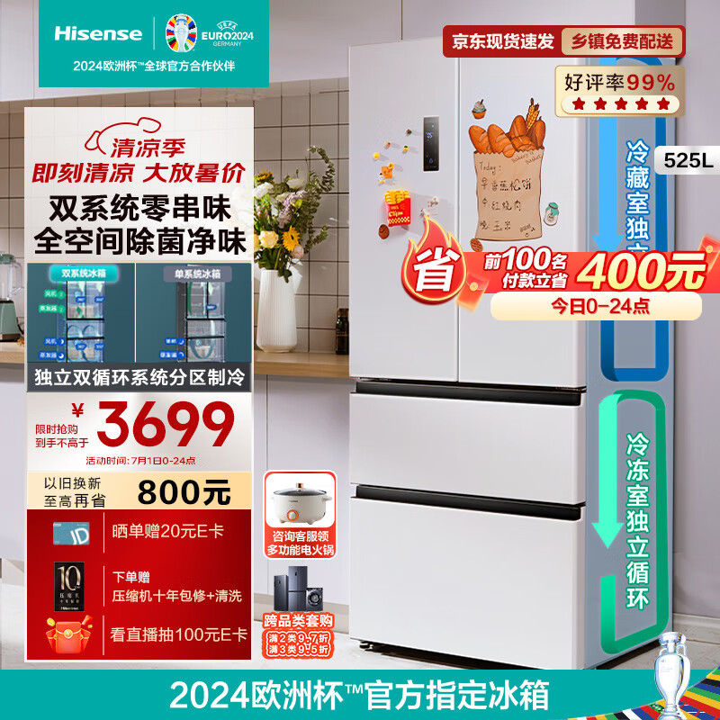 海信(Hisense)法式冰箱四开门家用电冰箱无霜冰箱一级能效525L全空间净化双系统双循环BCD-525WNK1PU-CY34白色价格:4099.00元!