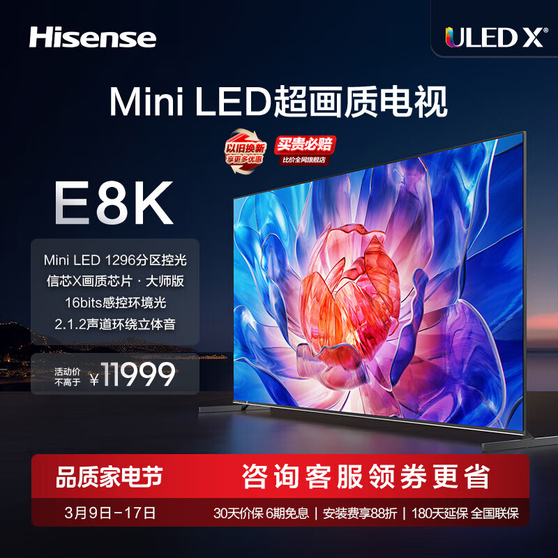 海信电视85E8K 85英寸 ULED X Mini LED 1296分区控光 4K 144Hz屏 液晶智能平板电视机价格:11888.00元!