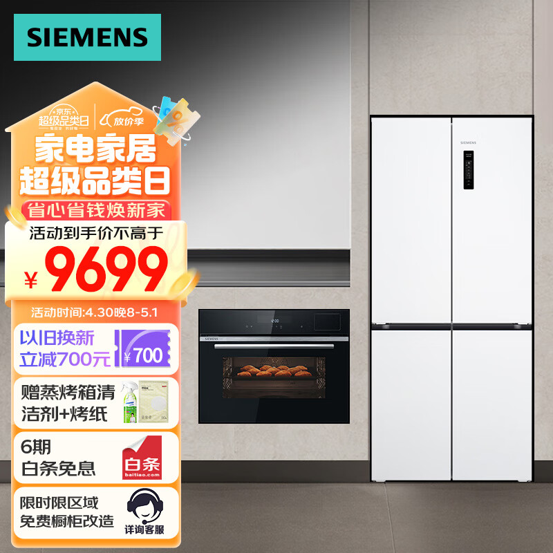 西门子(SIEMENS)嵌入式蒸烤炸炖四合一家用蒸烤箱+十字星系列497升超薄微平嵌冰箱CS8J4DNB1W+KC502080EC价格:9699.00元!