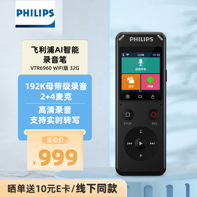 飞利浦(PHILIPS)录音笔VTR6960 2+4麦克风阵列192K母带级录音笔转文字翻译降噪便携录音器32GWIFI版价格:999.00元!