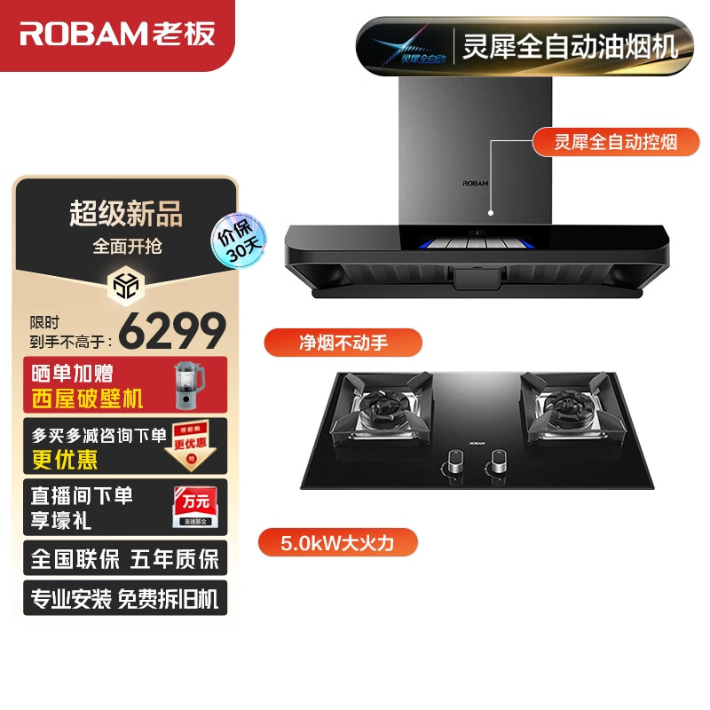 老板(Robam)灵犀全自动抽油烟机欧式顶吸双腔变频25大风量家用燃气灶吸油烟机灶具套装63A3S+57B2D天然气价格:6299.00元!