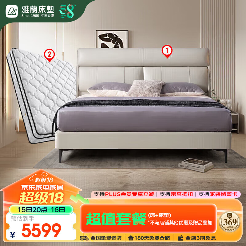 雅兰简约风真皮床主卧靠背可调节双人皮艺床 套餐 伯明翰 1.8*2米价格:6599.00元!
