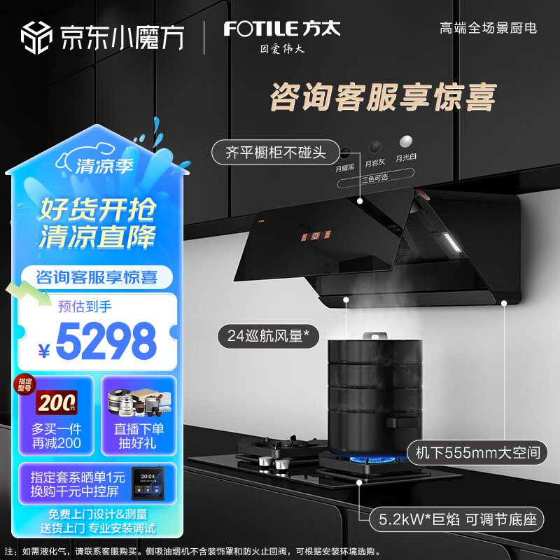 方太(FOTILE)新月抽吸油烟机灶具套装侧吸式变频烟灶24巡航风量智能挥手5.2kW火力燃气双灶 F1A+02-TH27B天然气价格:5298.00元!