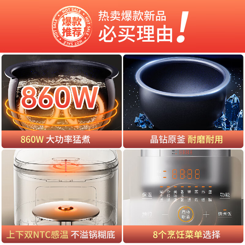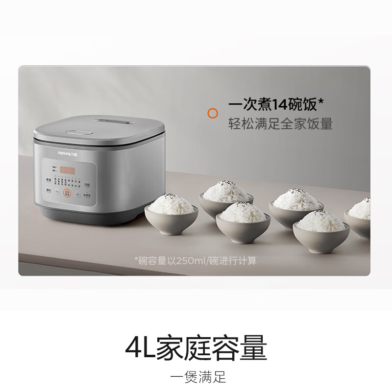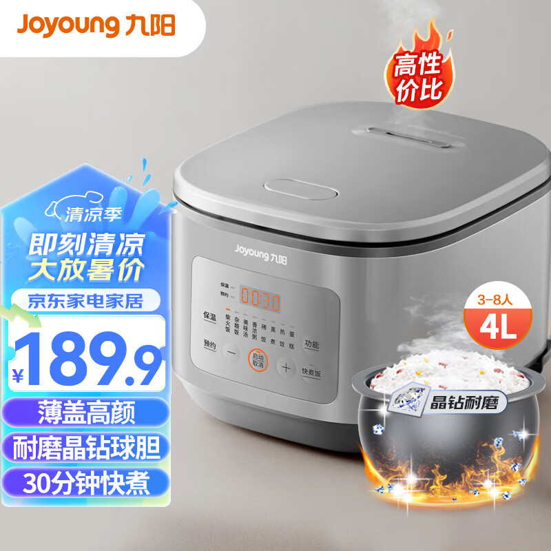 九阳(Joyoung)4升3~8人家用电饭煲电饭锅大火力柴火饭多功能焖煮防溢薄盖高颜晶钻耐磨4L电饭煲F-40FZ585价格:189.90元!