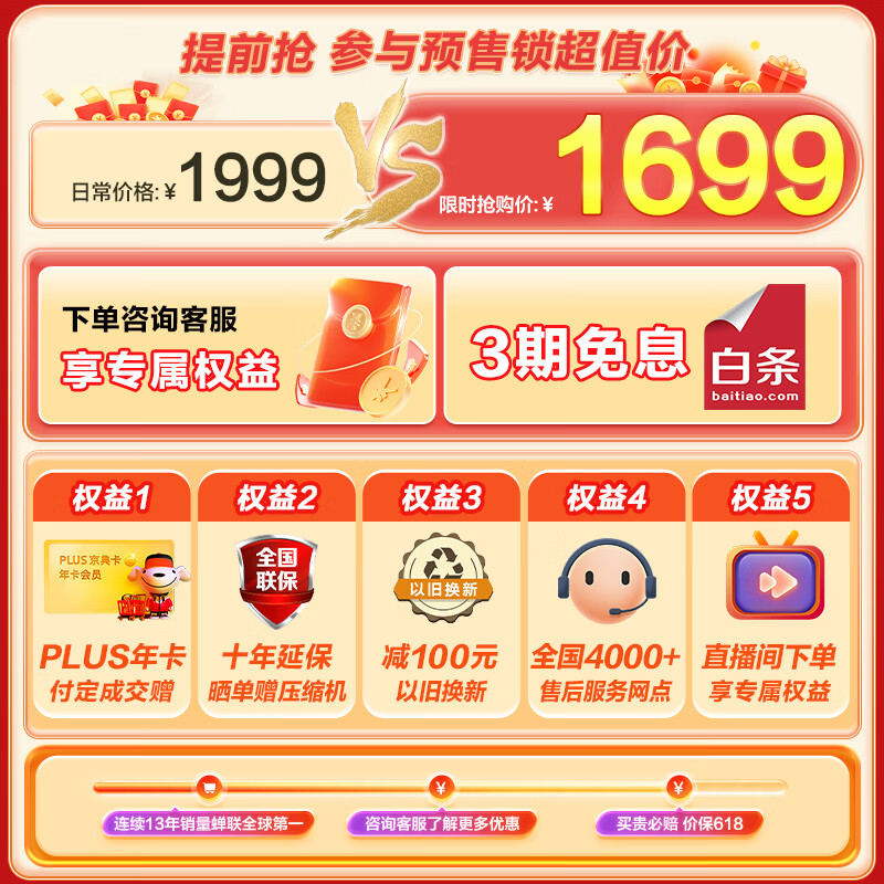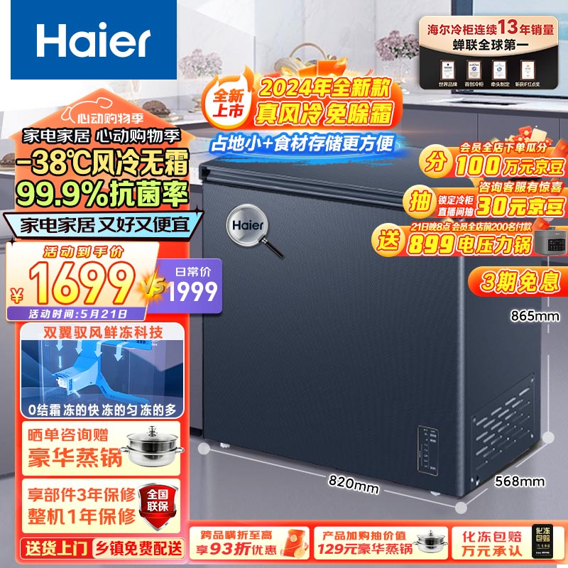 海尔(Haier)159升风冷无霜冰柜家用商用一级能效省电保鲜全冷冻卧式冷柜BC/BD-159WGHED以旧换新价格:1699.00元!