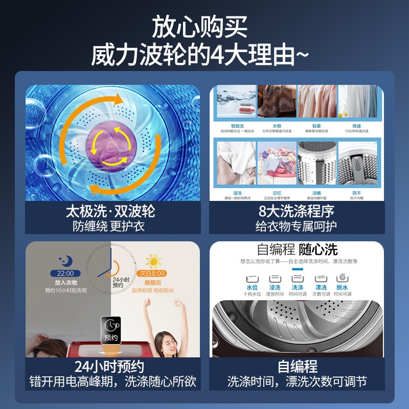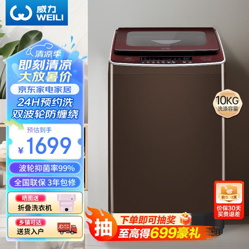 威力(WEILI)波轮洗衣机全自动 10公斤大容量 双波轮防缠绕 阻尼玻璃面盖 自编程24H预约 XQB100-2028T价格:1699.00元!
