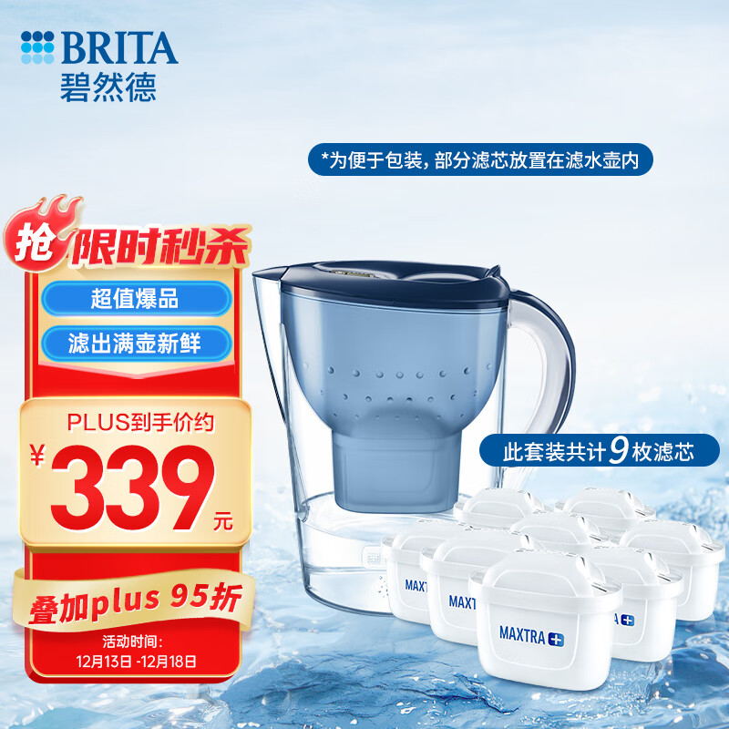 碧然德(BRITA) 滤水壶Marella蓝色3.5L 1壶9芯套装 海洋系列 家用过滤自来水净水器 净水壶配9只滤芯价格:356.00元!