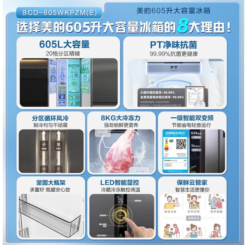 美的(Midea)605升家用超薄可嵌入对开门双开门智能电冰箱变频 一级能效节能 无霜净味 BCD-605WKPZM(E)价格:3099.00元!