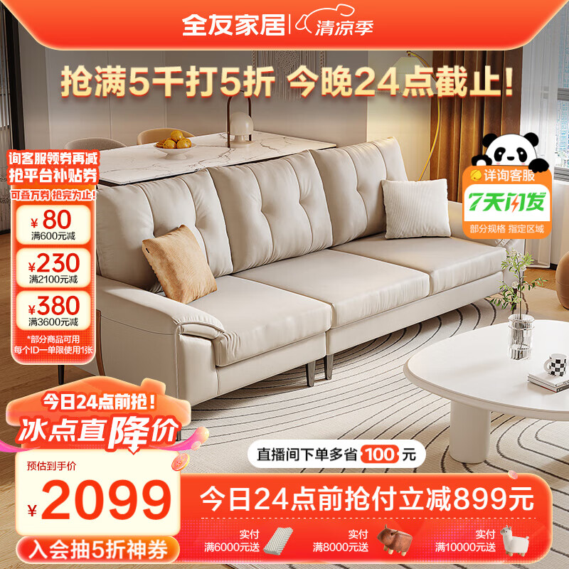 全友家居 科技布沙发客厅现代简约奶油风小户型直排布艺沙发111037价格:2998.57元!