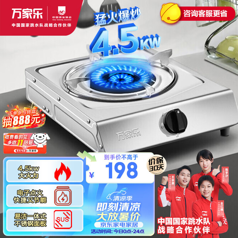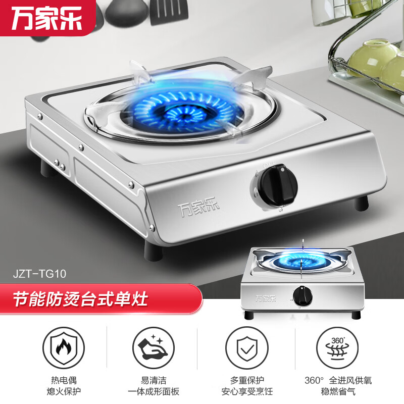 万家乐燃气灶单灶 4.5kW大火力 家用台式灶 猛火节能 不锈钢面板JZT-TG10天然气价格:198.00元!
