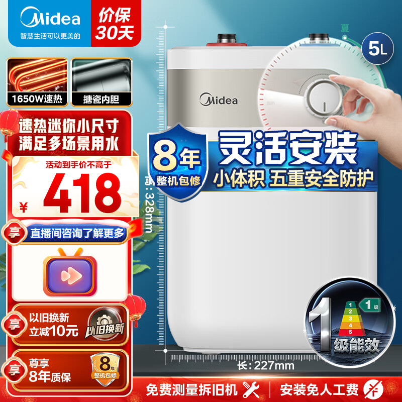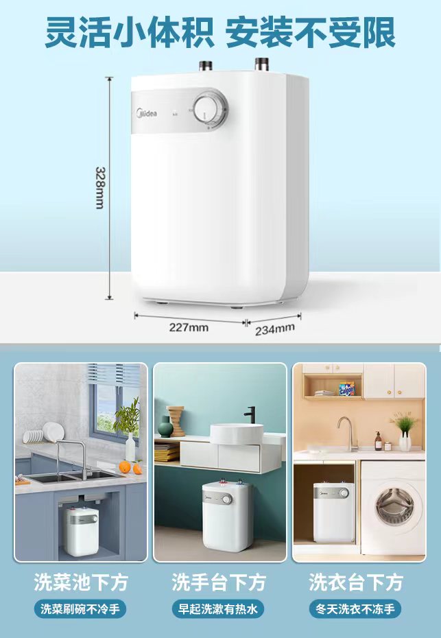 美的(Midea)5升家用小厨宝储水式 即热型迷你上出水厨房专用电热水器 钻内胆防护 速热迷你小尺寸热水宝 【2000W】F05-20A1(S)价格:499.00元!