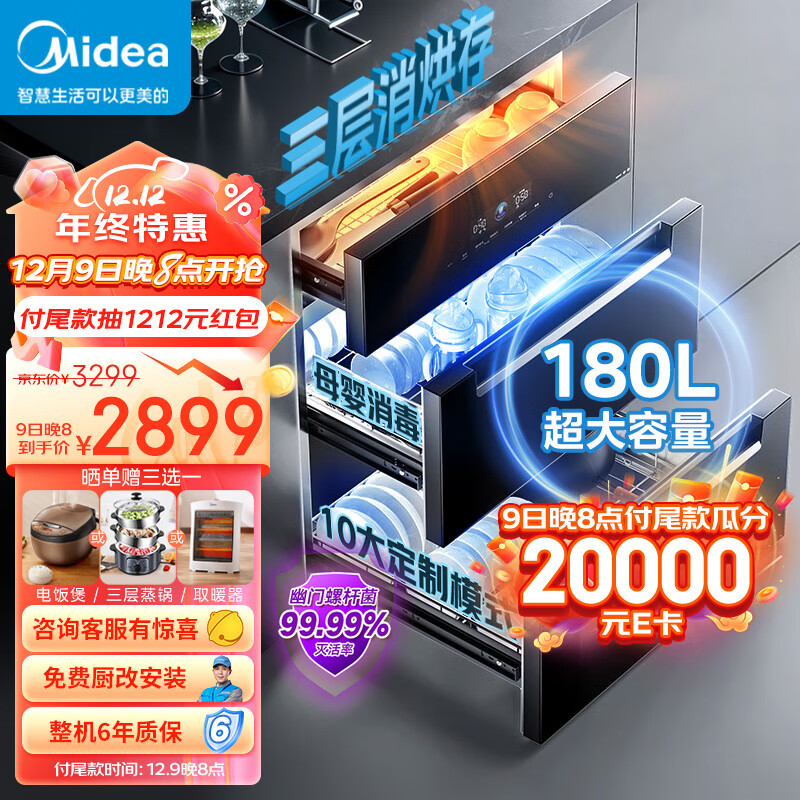 美的(Midea)消毒柜家用 嵌入式 厨房餐具碗柜碗筷 180L三层大升数 婴儿奶瓶不锈钢紫外线 AI家电200XQ2银河价格:2899.00元!