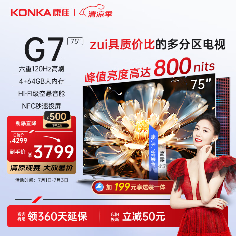 康佳电视 75G7 75英寸多分区背光 120Hz MEMC 4+64G 4K超清屏巨幕液晶平板游戏电视机巨幕 欧洲杯价格:3799.00元!