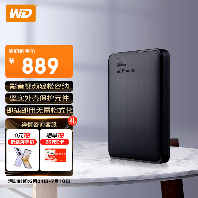 西部数据(WD)4TB 移动硬盘 USB3.0 Elements 新元素系列2.5英寸 机械硬盘 大容量 手机电脑外置外接价格:889.00元!